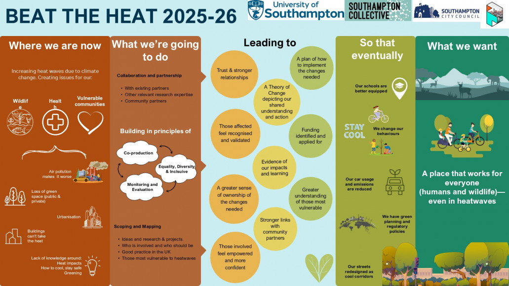 Southampton City Council's Sustainability and Natural Environment team are part of this project, and other departments will join in as appropriate. Southampton City Council Public Health Team is interested in collaborating with ‘Beat the Heat’, subject to capacity, given the strong links between heat and health.