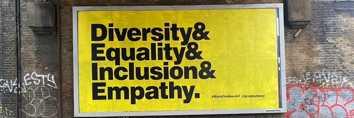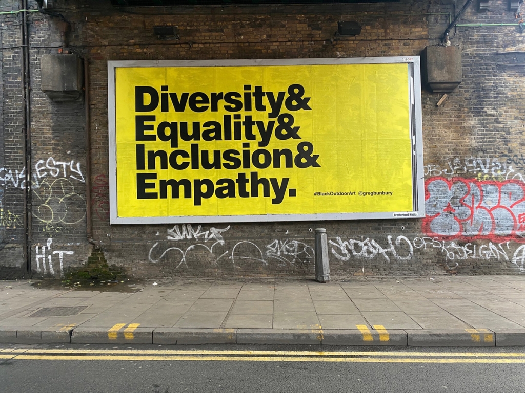 Image credit: ‘Diversity and Equality and Inclusion and Empathy’ by Greg Bunbury (b.1976), Black Outdoor Art. Image used in Beam’s Research Report ‘Building a More Diverse & Inclusive Public Art Sector’.